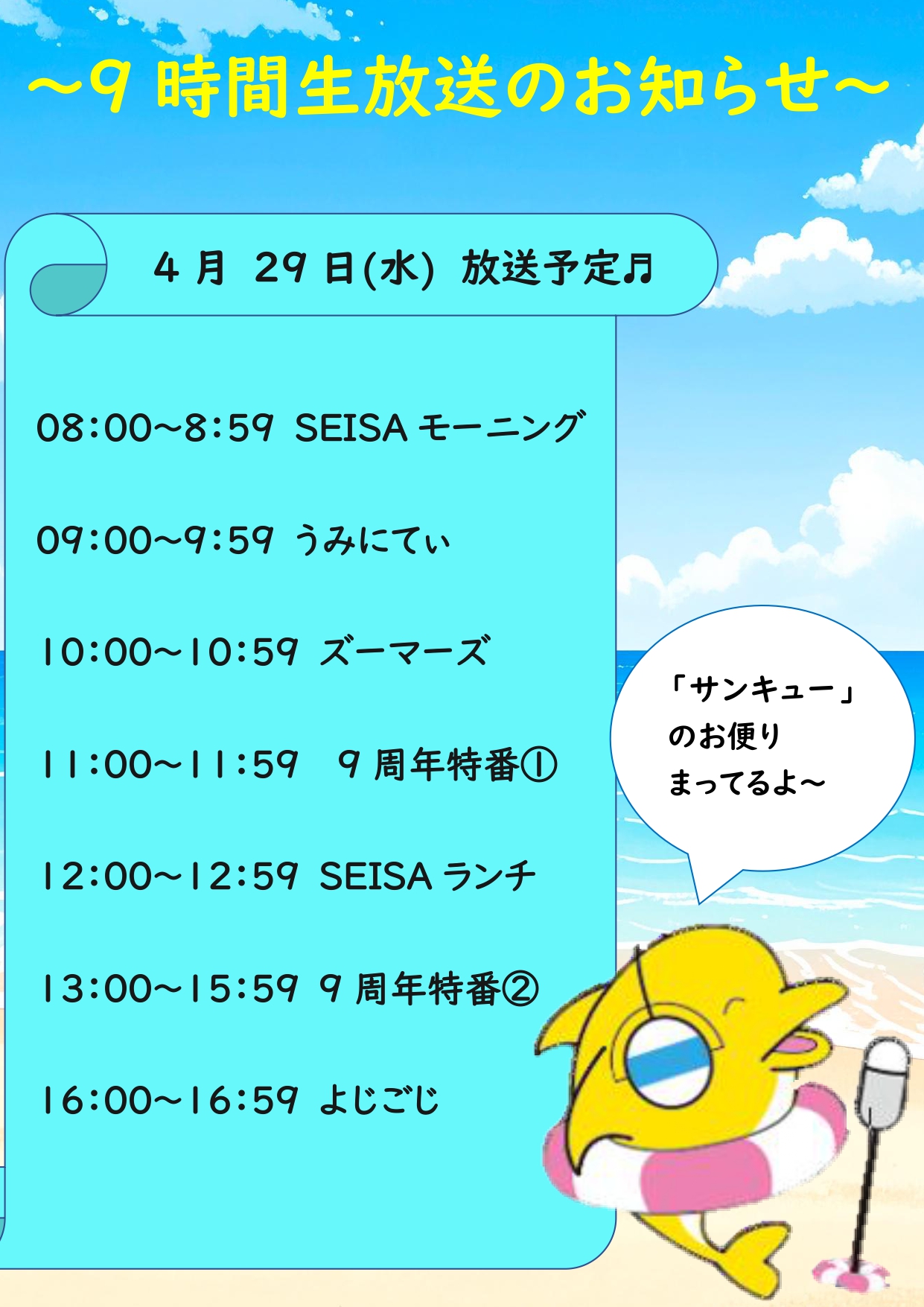 4月29日(水・祝)に9周年記念 9時間生放送をお届けします